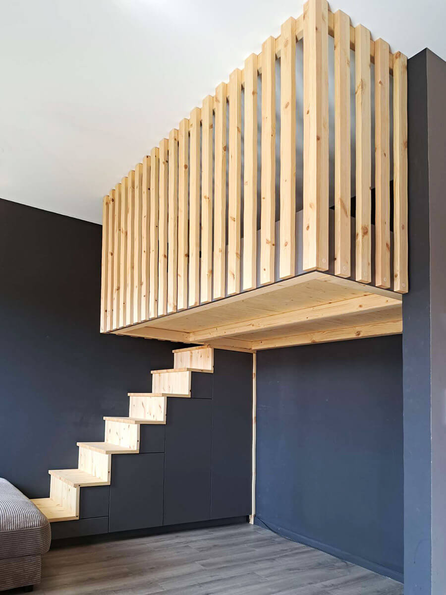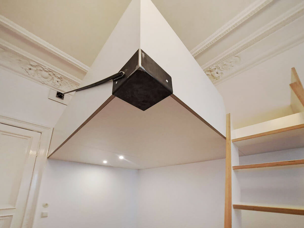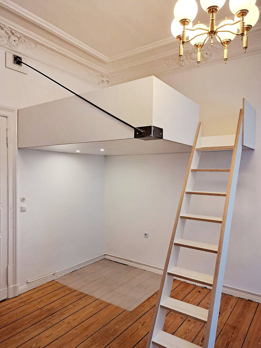 Wenn Ihre Decke stabil genug ist, können wir Ihr Hochbett auch an der Decke befestigen / verankern. Dadurch entsteht eine besonders cleane Optik und es sind keine störenden Stützbalken im Raum oder an den Wänden nötig. Das Hochbett bekommt dadurch einen "schwebenden" Charakter, wirkt besonders modern und fügt sich wunderbar Ihren Wohnraum ein.