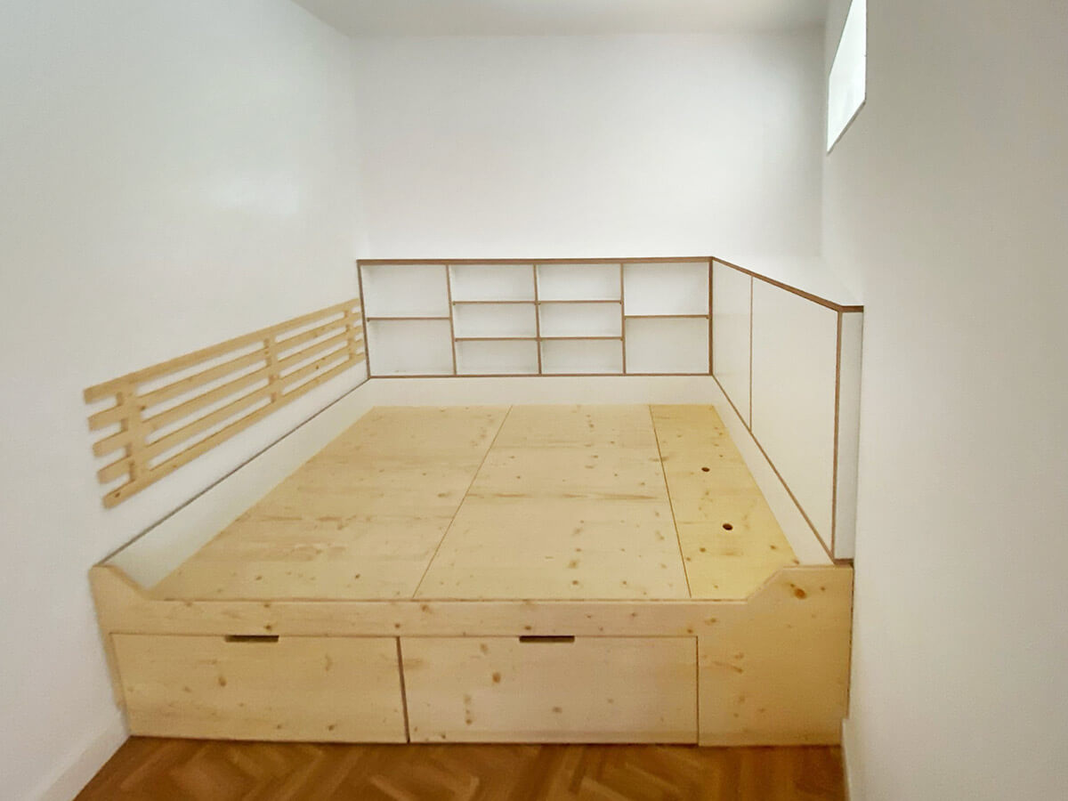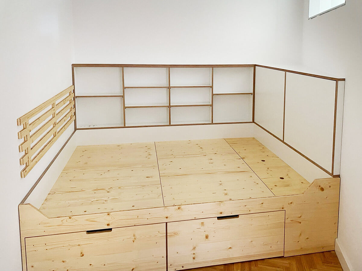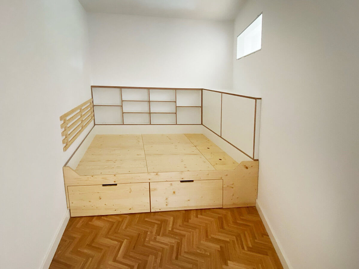Podest-Ebenen von Wand zu Wand mit Stauraum, ausziehbaren Schubkästen oder Schranktüren.